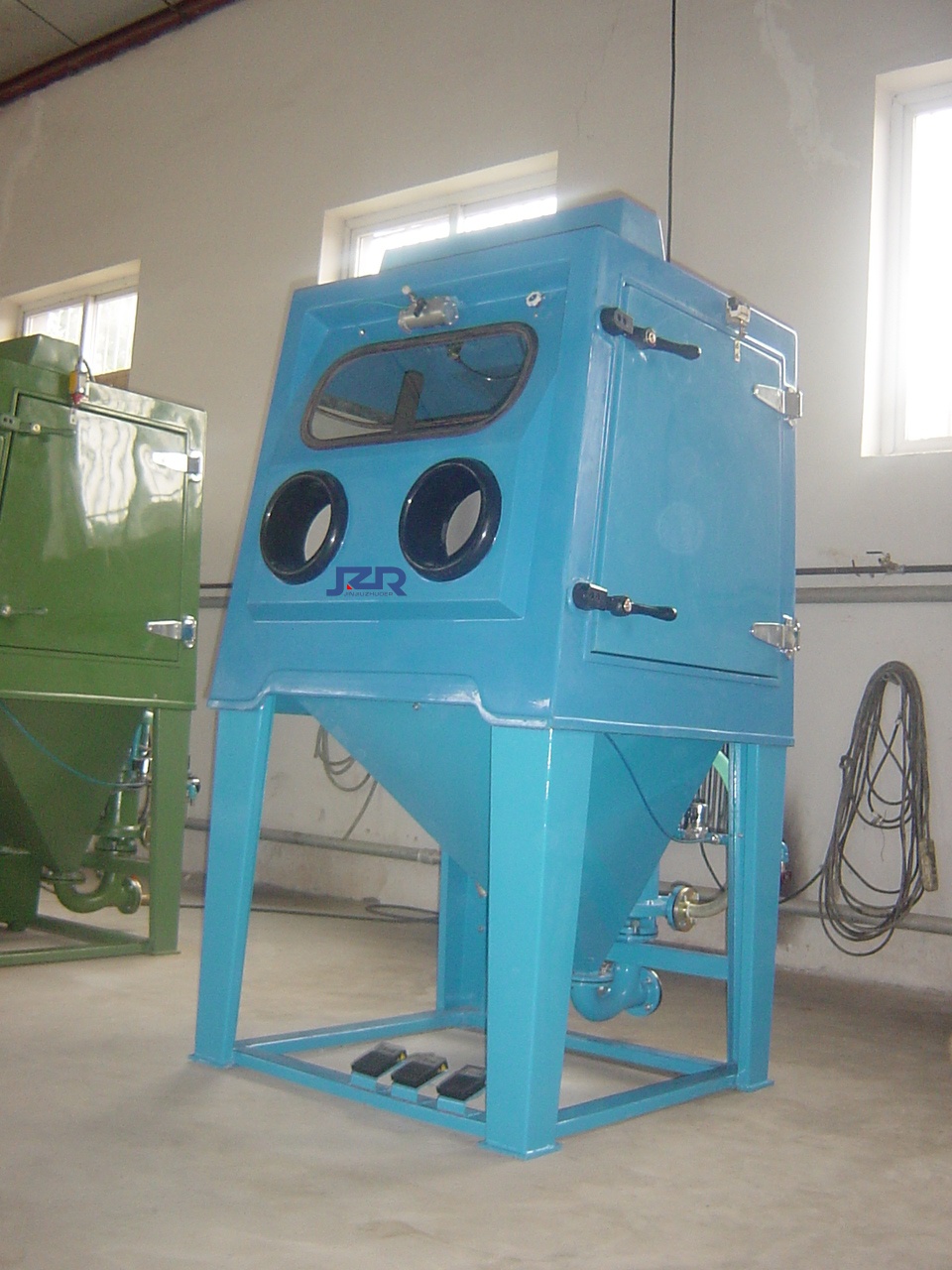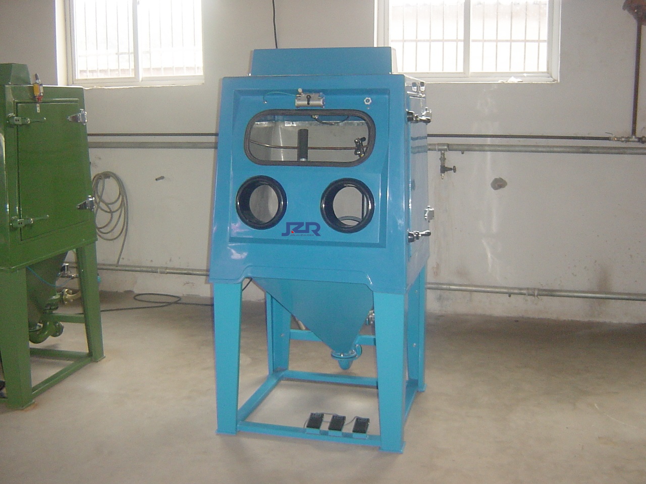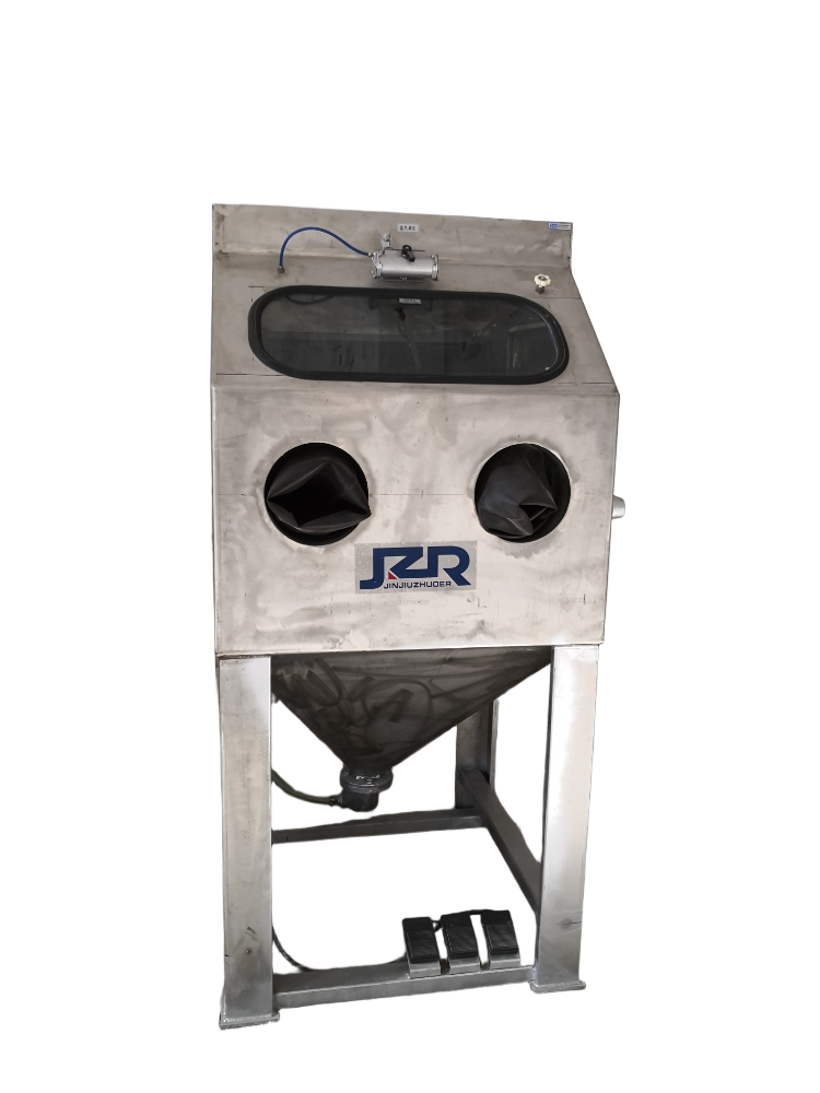 首先,液體噴砂機由磨液泵、水砂混合箱、攪拌裝置、噴射系統(tǒng)、控制系統(tǒng)機殼、自動化輔助系統(tǒng)等。磨液泵負(fù)責(zé)提供穩(wěn)定的水砂流,確?;旌弦旱某掷m(xù)供應(yīng);磨料混合箱配合攪拌系統(tǒng)為磨液泵提供水砂充分混合的介質(zhì)流,通過壓縮氣二次加速,形成均勻穩(wěn)定高速的的射流;噴嘴作為關(guān)鍵的噴射部件,負(fù)責(zé)將射流高速噴射到被加工表面上;機殼具備遮蔽及導(dǎo)流的作用,讓射流中的水及磨料快速轉(zhuǎn)移動混合箱中,從而讓噴射工作形成閉環(huán)。